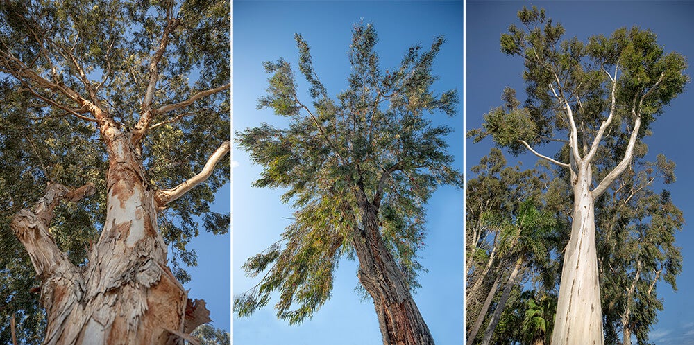 Depending on the species, a eucalypt’s dead outer bark may peel off, or it may stay on the tree. Trees with dead bark that clings to the trunk and branches are referred to as “rough-barked” trees. In about half of eucalypt species—referred to as “smooth-barked” trees—the dead outer layer of bark completely sheds, exposing a new layer of smooth, living bark. Shed bark accumulates under the trees.[/caption] [caption id="attachment_135437" align="aligncenter" width="1000"]