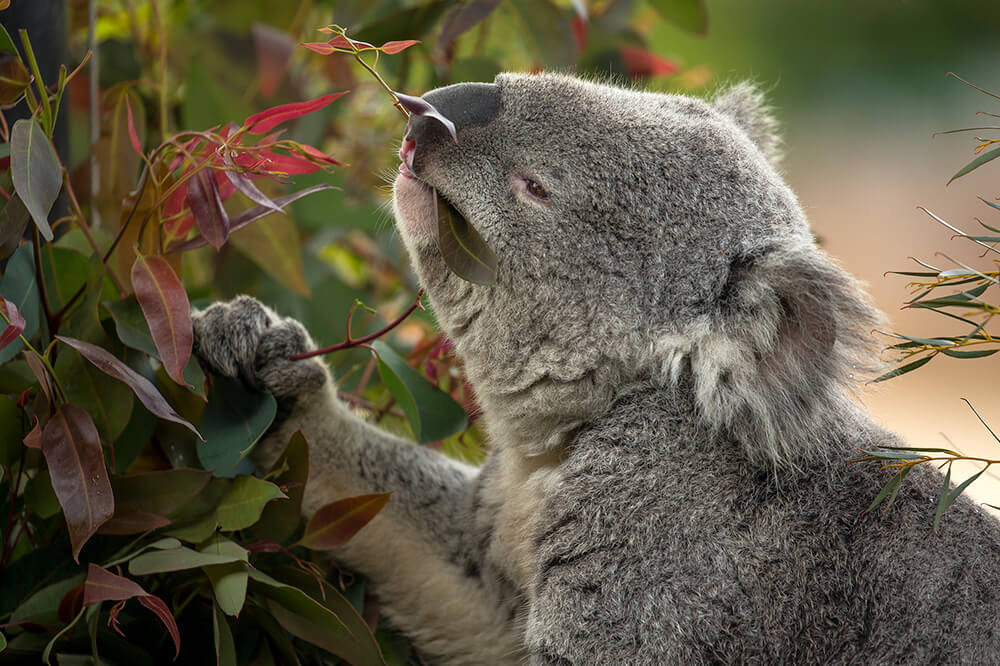 To feed koalas, the San Diego Zoo grows 35 varieties of eucalyptus on our 10-acre browse farm. When higher parts of a tree are cut, buds beneath the bark develop into new shoots, which allows us to keep the trees low and bushy.[/caption] Eucalypt leaves produce aromatic, volatile oils—so described because they evaporate at medium temperatures—that are an important ingredient in many pharmaceutical products, cosmetics, soaps, and even some industrial products. Forests of gum trees can actually appear hazy due to oil vapor—the bluish haze of eucalyptus oil gave the Blue Mountains west of Sydney their name. Australian soldiers returning home by ship from World Wars I and II said they could smell the welcome fragrance even before they could see land on the horizon. Eucalypt nectar is prized too, by honeybees and beekeepers. Honey takes on different flavors depending on the bees’ food source. Some types of honey are marketed under the name of the main gum species frequented by the bees. In fact, eucalypt nectar is also food for other insects, birds, bats, and Australia’s tiny honey possum. [caption id="attachment_135434" align="aligncenter" width="1000"]