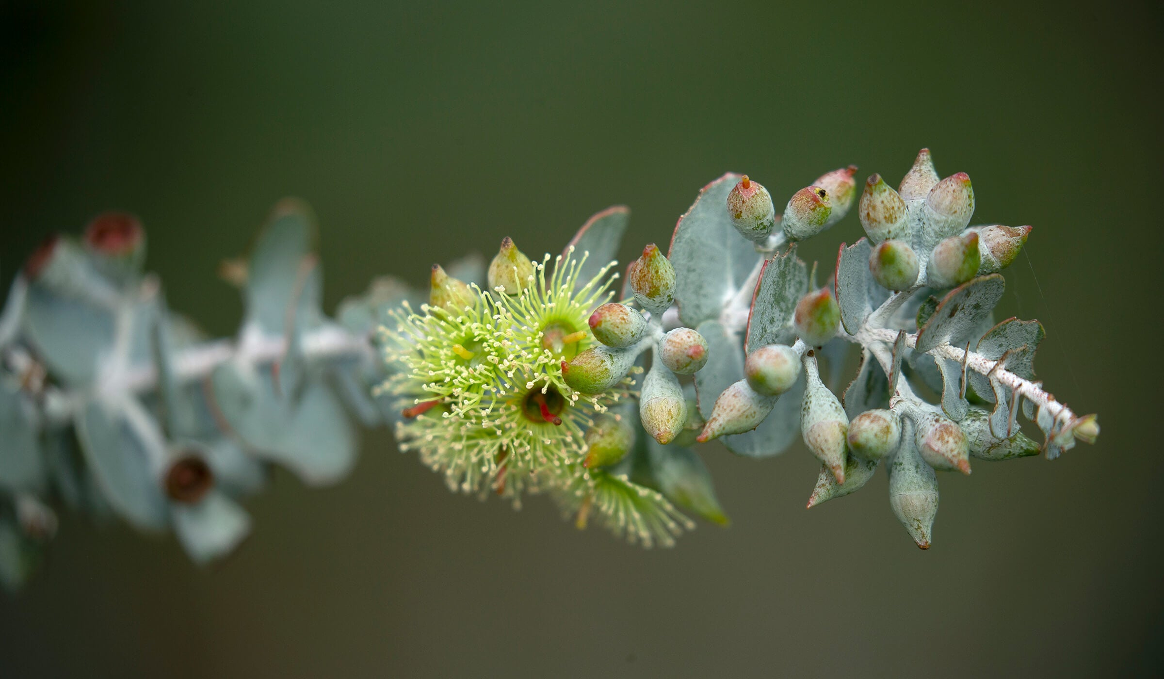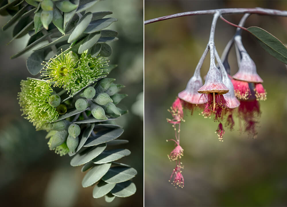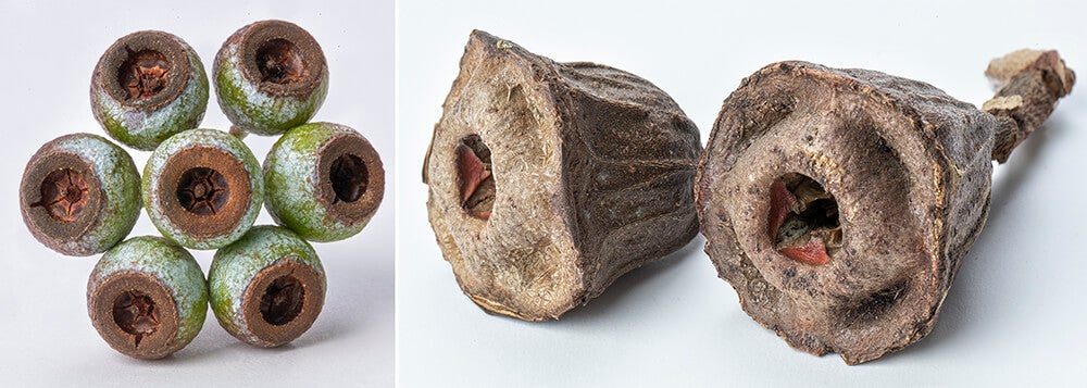 (Left) A close look at a eucalypt shows that buds form in odd-numbered clusters. In 99 percent of species, there are no flower petals; they are modified into a little cap that covers and protects the developing bud. As a bud starts to open, it pushes the cap off. (Right) Without petals, the showy parts of a euc’s puffball-like flower are its numerous, pollen-tipped stamens (male parts), which may be whitish, cream, yellow, pink, or red. Myriad stamens surround a single, central carpel (the female part). Stamens mature, and pollen disperses, before a flower’s carpels mature, preventing self-pollination.[/caption]