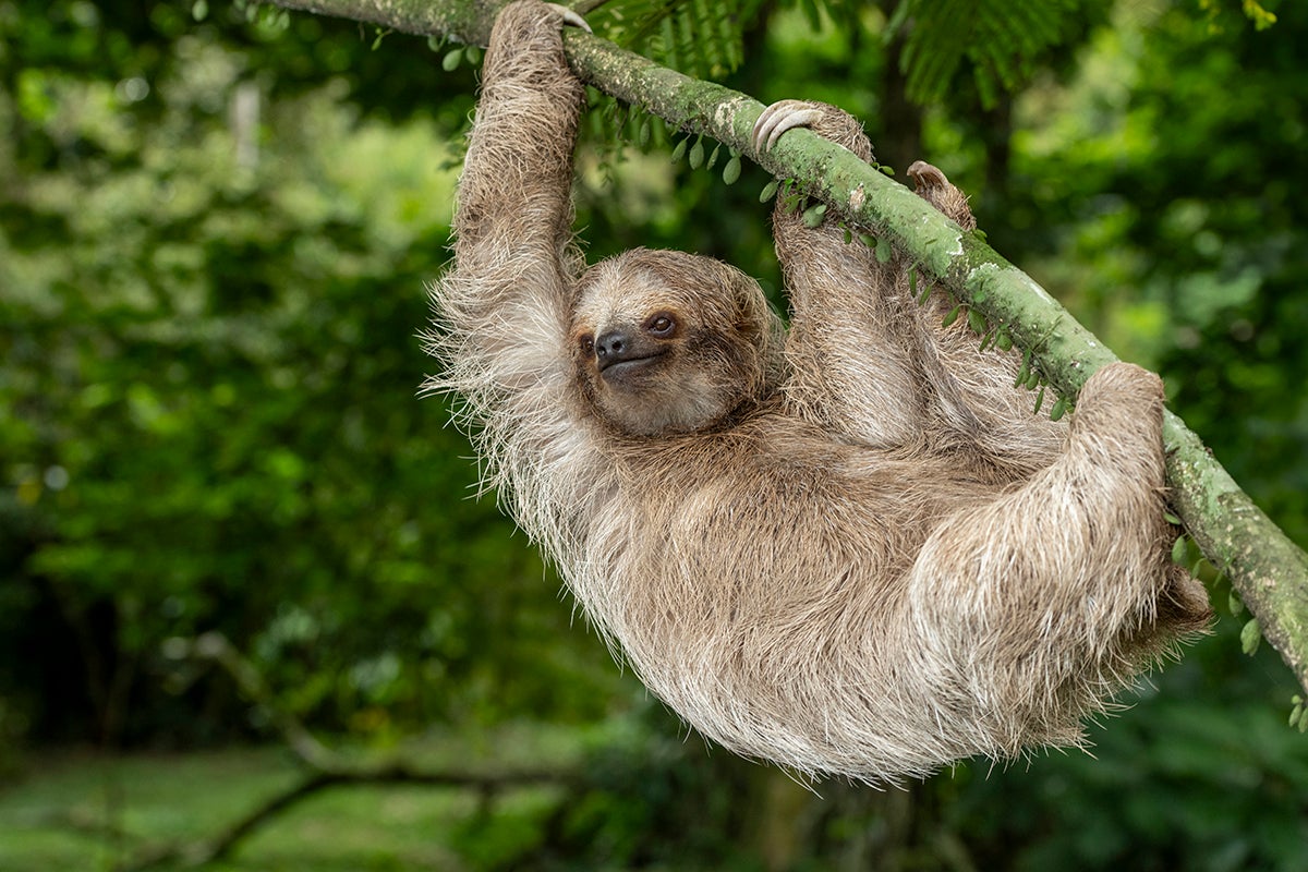 When the tree-dwelling three-toed sloth (pictured above) in Costa Rica makes its weekly descent for a bathroom break, it carries with it the pyralid moths that live in its fur. The moths get their nutrition from the sloth’s skin. The moths increase the nitrogen content of the sloth’s fur, helping lipid-rich algae grow, which the sloth needs to supplement its limited diet. While the sloth is on the ground, female moths emerge from the sloth’s fur to deposit their eggs in the sloth’s feces. The moth larvae become moths that flutter back up into the tree overhead. There they find a sloth and burrow into its fur, starting the cycle again.