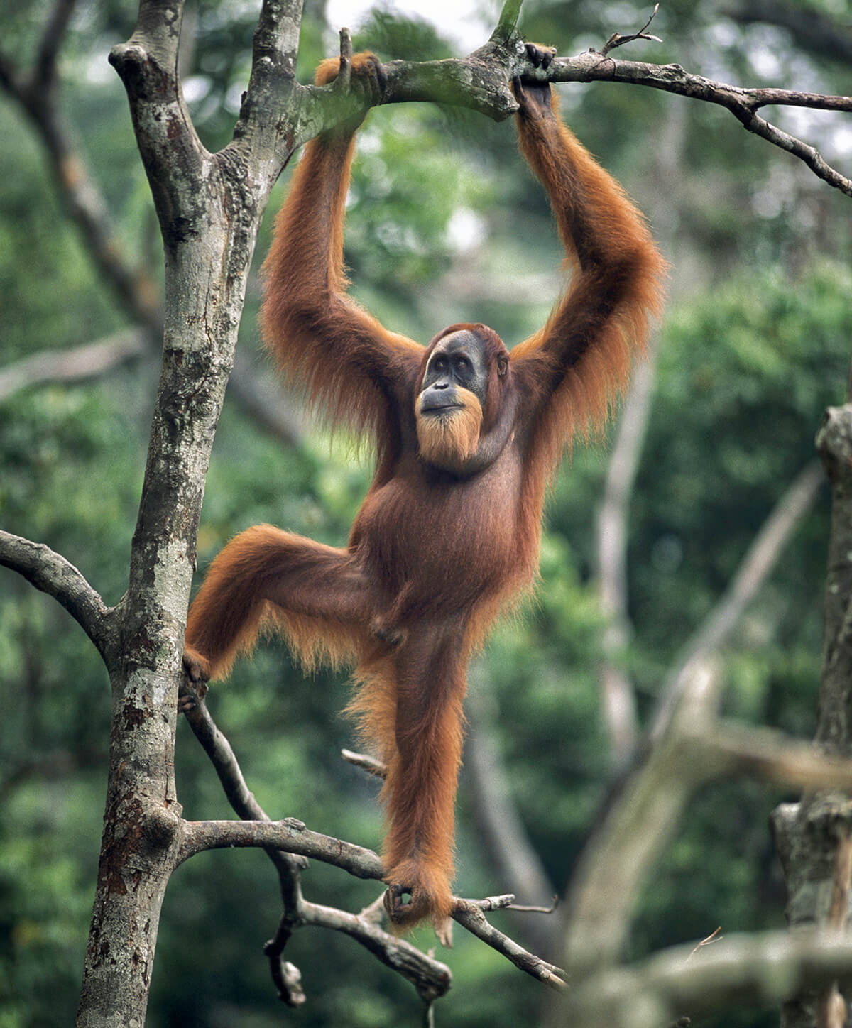 If you want to spot an orangutan in the wilderness of Borneo or Sumatra, you’ll have to look up. These shaggy red apes spend most of their life in the trees, feasting on ripe fruit and climbing, clambering, walking, and swinging confidently from branch to branch. With arms longer than their body; long, strong fingers; and grasping toes, life in the trees is a breeze. Females even give birth high in the rainforest. At the San Diego Zoo, the orangutan’s habitat includes climbing structures that are joined by ropes and cargo nets, and vertical “sway poles” that gently bend like tree branches and help create aerial pathways through the habitat.