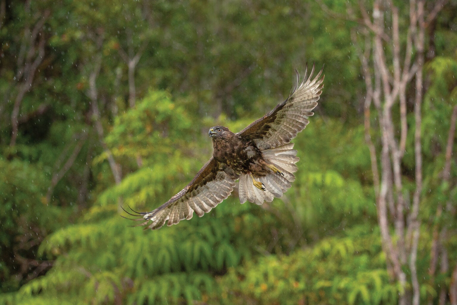 The ‘io is a clever and adaptable bird that can thrive in a variety of habitats. They live in forests, grasslands, and even suburban backyards, at elevations ranging from sea level to over 6,000 feet. They typically bond and mate with one partner for life, building a nest together in trees, and taking turns incubating eggs. An important predator in ecosystems throughout the island, the ‘io opportunistically forages on a wide range of prey, including insects, small mammals, and even other birds. It plays a crucial role in controlling the populations of other wildlife, especially non-native, introduced rodents. For example, ‘io prey on mice and rats that can damage crops and spread disease. The ‘io is well-recognized and held in high esteem by locals. Native Hawaiians consider them an ‘aumakua—a visible manifestation of a family or personal god, and they occupy a central place in the culture, art, and traditions of the Hawaiian Islands.