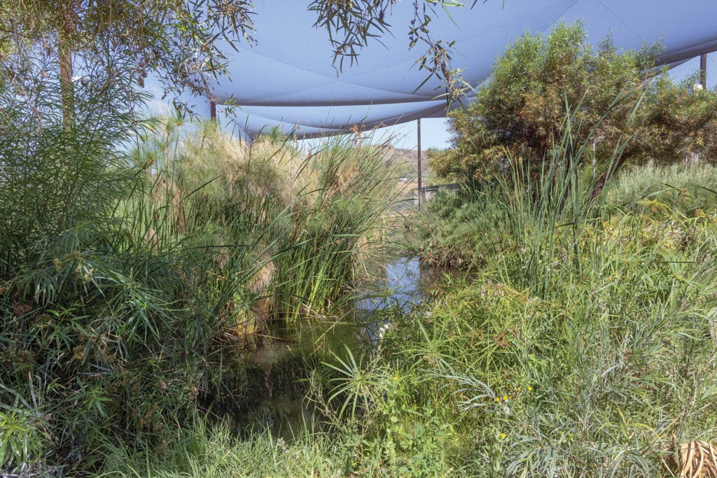 The milky stork habitat at the Safari Park's Bird Breeding Center is a naturalistic re-creation of the birds' native habitat in the wetlands of Southeast Asia.