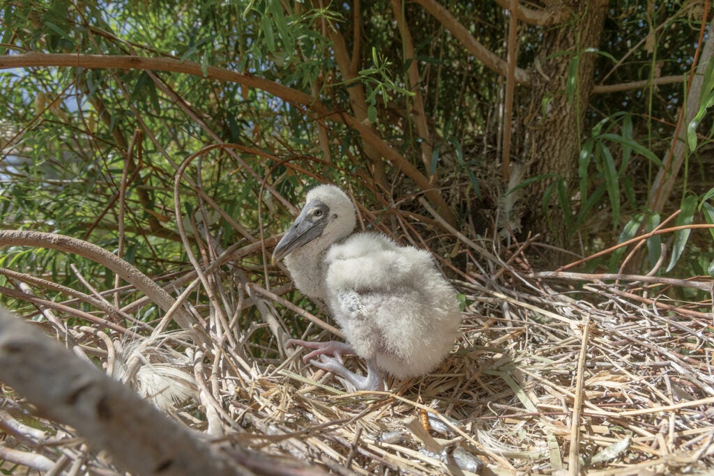Since their arrival, the storks have been exhibiting courtship and pair-bonding behavior, and nesting continually. The colony has fledged four chicks so far—adding four precious new members to this endangered population. Male and female parents share duties at the nest. “Both parents participate in chick rearing, all the way to the end,” says Jenny. While the pair bond is strong until a chick is fledged, it dissolves when the young birds leave the nest. “That’s a good thing, because our population is skewed female,” says Jenny. The hope is that as males change partners, breeding females get a little time off, as producing eggs is a nutrient- and energy-intensive undertaking. It may also help maintain genetic variability.