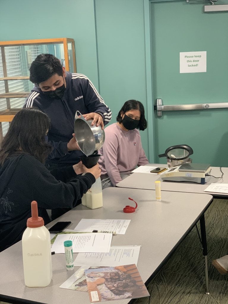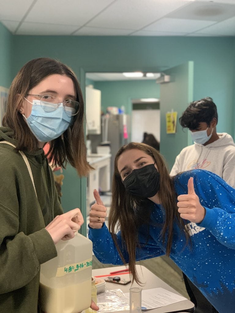 Two of the interns hold up their finished bottle of kudu baby formula.