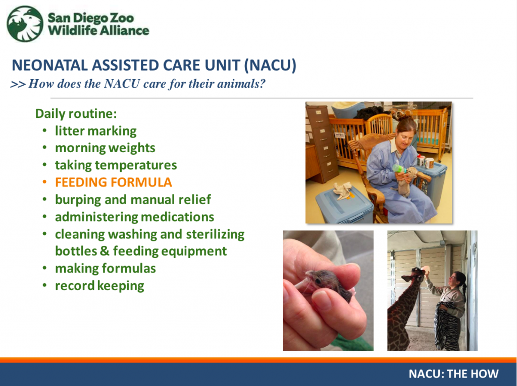 As she described her career and what it entails, Mrs. Bohy shared both the ups and downs of working as a Neonatal Assisted Care Specialist at the San Diego Zoo. Working “graveyard shifts” (sometimes staying until 6 AM!), emotional rollercoasters, and precise, advanced medical knowledge and application are all a part of her taxing job. Mrs. Bohy finds giving shots to be the most difficult of the various tasks and challenges she faces, due to the many measures required to safely go about it. To administer an injection, the staff takes necessary precautions to make the animal feel as comfortable as possible, whether it be nursing it with a bottle, covering it snugly with blankets, or providing a heat mat to lie on.
