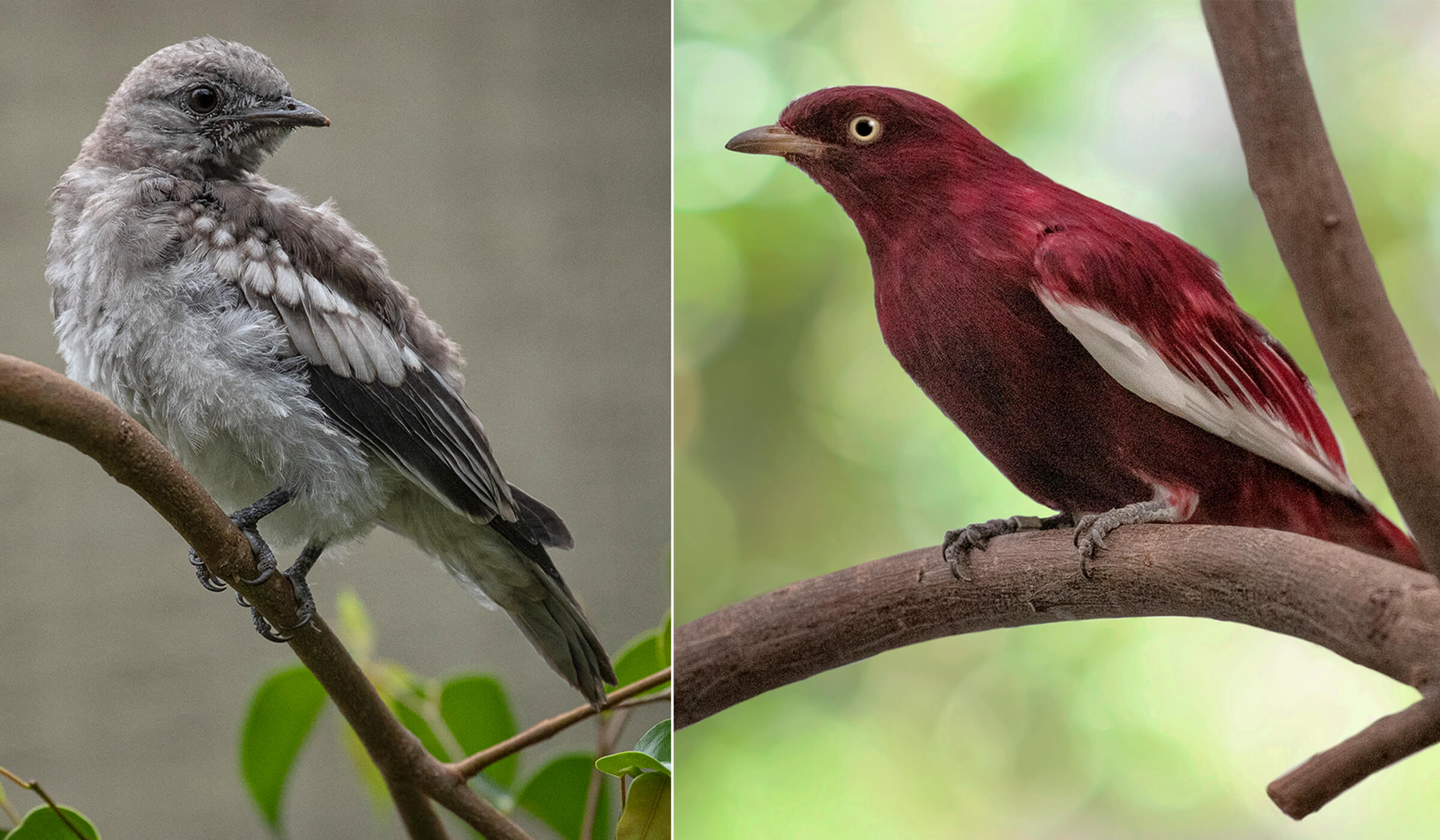 Animal care specialists at the Zoo’s off-exhibit Avian Propagation Center were thrilled this spring when a pair of pompadour cotingas hatched and raised a chick. It was a first for the species at the Zoo, and we’re all looking forward to seeing the little one (left) achieve its stunning adult color (right).[/caption]