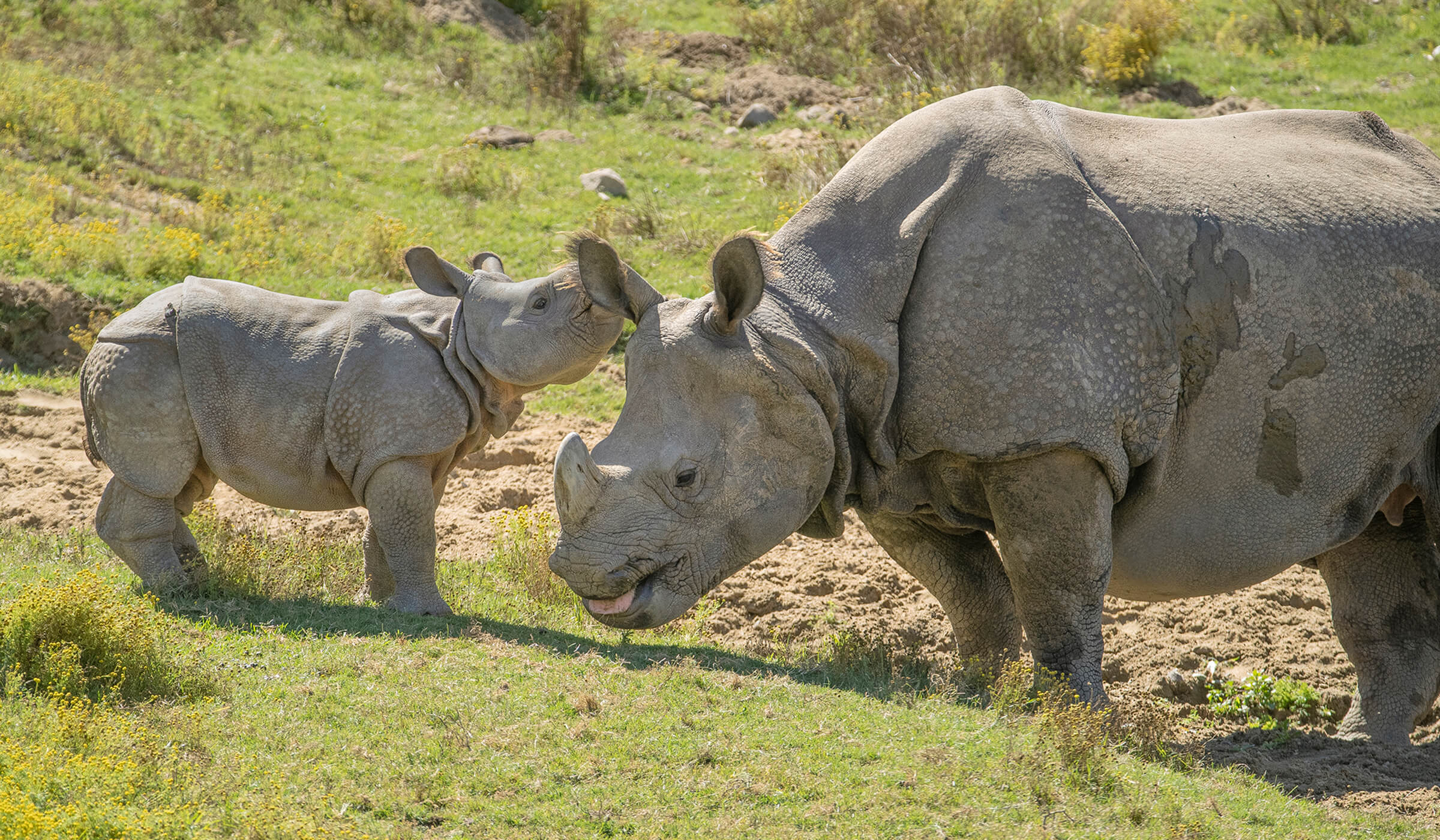 In the Asian field habitat at the Safari Park, our greater one-horned rhino population grew by two. Mother rhinos Asha and Tanaya gave birth to their calves just over two weeks apart, on March 25 and April 11, respectively. Both mom-and-calf pairs enjoyed plenty of private time for bonding in separate housing areas. [caption id="attachment_136778" align="aligncenter" width="1400"] HOWDY, NEIGHBOR
