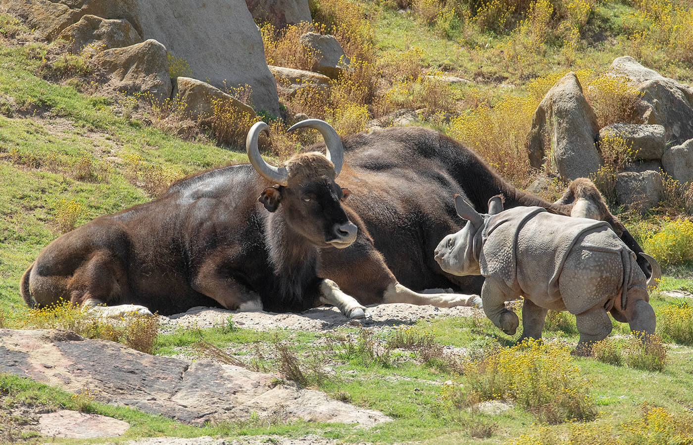 Once he got the feel of the habitat, Arjun began checking out the neighbors, like this pair of Indian gaur.[/caption] On May 20, 2020, habitat gates were opened, and as animal care specialists carefully observed, the littlest rhinos ventured out with their mothers into a 40-acre habitat. Tanaya and her female calf stepped out first. Together, they made use of a mud wallow, then headed out to explore the rest of the area. Not far behind them, Asha led her male calf, Arjun, farther onto the savanna, exploring the grassy hills. With curiosity fueling a bit of boldness, he ventured several feet away from Asha. But when he came face to face with one of his new neighbors, a Javan bantang, he quickly returned to his mother’s side.