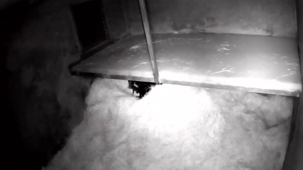 Screen shot from closed-circuit video camera of Andean bear mother, Alba, and her 7-day-old cub